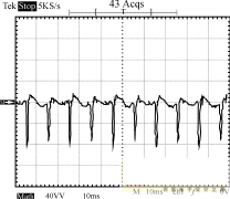 圖8~圖10為輸入電壓220V的條件下,輸出端的負載狀況分別為空載、半載和全載時,輸入端的功率波形圖。由這3個圖可以看出,輸入功率是個脈衝序列,周期為10ms,即每半個工頻周期電源輸入端通過整流橋為輸入平滑濾波電容充一次電。測量輸入功率時串聯於輸入端的采樣電阻為2.0Ω,因此功率為圖示值除以2。半載時輸出功率為:12.3662/10=15.29W,全載時輸出功率為:12.2552/5=30.04W。電路正常工作時,漏極電壓波形如圖11所示。
