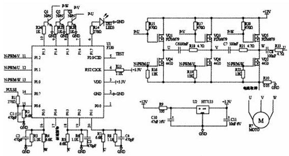 無位置傳感器控製係統以C8051F330單片機、逆變橋電路、端電壓檢測電路、穩壓電路等組成。逆變橋電路中上橋臂為P型MOSFET器件FDS6679,下橋臂為N型MOSFET器件M4410B,均為低電壓驅動器件。FDS6679通過一個NPN型三極管驅動,而M4410B由C8051F330的P1口直接驅動(P1口設置成推挽輸出)。PWM控製模式定為:PWM僅應用於半橋的下端MOSFET,同時換流的上端(對角線)MOSFET僅起換相通斷控製。