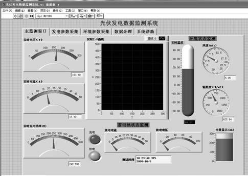 由於Labview使用G語言(圖形化語言)進行程序設計,因此該係統界麵包含了光伏發電監測係統所要進行監測的溫度、電流、電壓以及輻照度等的全部信息,Labview中的VI程序由前麵板、程序框圖、VI圖標3部分構成,其中前麵板是VI 程序的用戶操作界麵,是VI程序的交互式輸入和輸出端口。如圖4所示,係統前麵板即係統界麵主要由主監測界麵以及各種參數界麵組成。主界麵主要由發電參數監測模塊、環境參數監測模塊和數據處理模塊3部bu分fen組zu成cheng,各ge獨du立li參can數shu模mo塊kuai可ke以yi進jin行xing有you關guan的de參can數shu設she置zhi,實shi時shi顯xian示shi數shu據ju,數shu據ju處chu理li模mo塊kuai可ke以yi存cun儲chu相xiang關guan的de曆li史shi數shu據ju並bing進jin行xing數shu據ju回hui放fang,以yi便bian對dui特te定ding模mo塊kuai單dan獨du進jin行xing分fen析xi處chu理li。