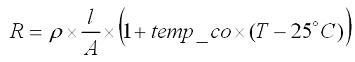 電感線圈的電阻溫度係數導致電感直流電阻會隨著溫度變化。線圈通常為銅製,溫度係數約為 3.9mΩ/℃,計算其電阻的等式如下: