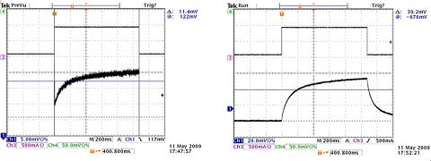 因為電流有些輕微依賴MOSFET的導通電阻,所以有必要在電流接近目標閃光電流時測量 PFET電阻。使用大測試電流的問題是它們可能導致器件發熱。克服此問題的方法是將閃光超時時間設置為最低 32ms,並在示波器上測量PFET的電壓降。在+25℃到+125℃的情況下,使用1.2A閃光電流,結果顯示的斜率大約為 0.42mΩ/℃ 。要注意的一個事情是PFET通過VOUT引腳供電,因此VOUT=5V時,其導通電阻會低於VOUT=3.9V時的電阻值。