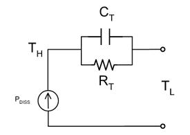該模擬可以深入進行,以描述器件的另一個熱屬性,稱之為熱容。正如將熱阻模擬為電阻,可以將熱容(CT,單位為J/℃)模擬為電容。將熱容與熱阻並聯獲得熱阻抗(ZT)。圖1所示為傳導傳熱的簡化RC模型。能源被模型化為電流源,熱阻抗被模型化為CT與RT並聯。