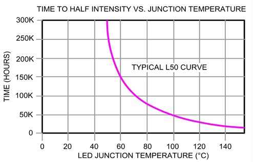 meizhongzhaomingshebeijuncunzaiguangyuanshiyongshoumingwenti,jingchangzaoyudezhuangkuangyouleisibaichidengpaodewusituranshaoduan,huoyinchangshijianshiyongershideguangyuancailiaoyinzhujianlaohuayizhibiananerguzhang,LED亦(yi)因(yin)組(zu)件(jian)的(de)接(jie)麵(mian)溫(wen)度(du)而(er)出(chu)現(xian)老(lao)化(hua)現(xian)象(xiang)。所(suo)有(you)的(de)照(zhao)明(ming)設(she)備(bei)在(zai)提(ti)供(gong)穩(wen)定(ding)亮(liang)度(du)條(tiao)件(jian)下(xia),於(yu)一(yi)定(ding)使(shi)用(yong)年(nian)限(xian)後(hou),亮(liang)度(du)勢(shi)必(bi)會(hui)逐(zhu)漸(jian)低(di)於(yu)有(you)效(xiao)亮(liang)度(du)之(zhi)下(xia)。在(zai)不(bu)同(tong)的(de)照(zhao)明(ming)應(ying)用(yong)裝(zhuang)置(zhi)中(zhong),皆(jie)有(you)使(shi)用(yong)壽(shou)命(ming)時(shi)間(jian)限(xian)製(zhi)。舉(ju)例(li)來(lai)說(shuo),當(dang)使(shi)用(yong)在(zai)路(lu)燈(deng)裝(zhuang)置(zhi)的(de)亮(liang)度(du)已(yi)衰(shuai)減(jian)至(zhi)原(yuan)先(xian)50%時,即代表使用年限,但使用在醫生內視鏡的光源裝置可能亮度尚未衰減那麼多。