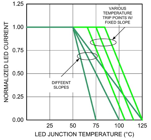 為防止組件遭受破壞或讓使用壽命縮短,必須進行熱能管理,且已有多種方法可以解決此問題。圖2為兩種不同的回折曲線,可在溫度上升時限製LED的電流流量。當接麵溫度保持在默認溫度範圍內時,就經由主要的控製回路作為電流調節;但dan當dang接jie麵mian溫wen度du超chao過guo默mo認ren範fan圍wei時shi,就jiu會hui使shi用yong另ling一yi組zu控kong製zhi回hui路lu限xian製zhi電dian流liu大da小xiao。其qi中zhong接jie麵mian溫wen度du的de回hui折zhe點dian與yu驅qu動dong電dian流liu的de衰shuai減jian率lv,均jun可ke依yi照zhao不bu同tong的de應ying用yong和heLED製造商的建議改變。