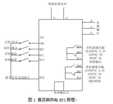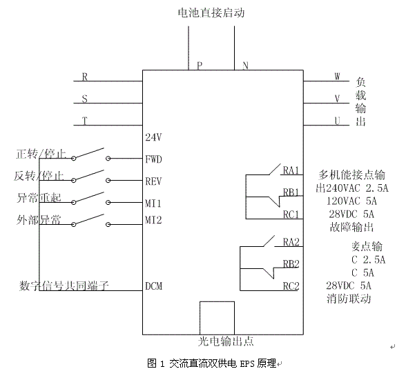 目前EPS采用的控製方式和控製手段不同,針對EPS所帶的負載可以歸納三種:一是主要用於應急照明和事故照明的EPS;二是除了應急照明、事故照明之外,還有應用於空調、電梯、卷簾門、排氣風機、水泵等混合負載的三相係列EPS;三是直接給電動機供電的變頻係列EPS。本文介紹的是最全麵的混合負載三相係列EPS供電。