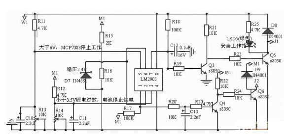 當鋰電池電壓低於315V 時,即電池電量釋放92%以上時,認為不能繼續放電,否則鋰電池內部介質會發生變化,致使充電特性變壞,容量降低等。 為此設計過放電保護控製電路,此電路的具體設計如圖3,分析如下:采用了LM 2903的1, 2, 3腳組成的一路比較器,與外圍器件構成過放電壓比較器, R12 , R14分壓後接至LM 2093的3腳。 當電壓值小於315V 時,分壓值小於214V, LM 2903的1腳由高電平轉變為低電平, Q4 由導通轉變為截止狀態, Q6 飽和導通, JDQ2工作,同時過放紅色指示燈亮。