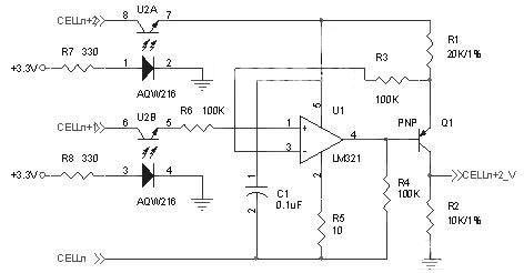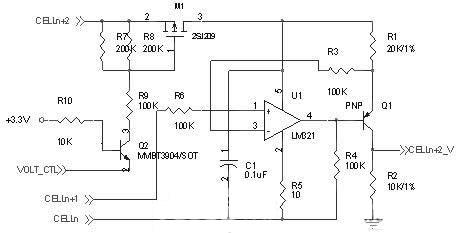 圖中CELLn為第n節(jie)單(dan)體(ti)電(dian)池(chi)的(de)電(dian)壓(ya),該(gai)電(dian)路(lu)可(ke)以(yi)對(dui)多(duo)串(chuan)電(dian)池(chi)組(zu)的(de)電(dian)壓(ya)進(jin)行(xing)測(ce)量(liang),並(bing)且(qie)不(bu)受(shou)串(chuan)聯(lian)節(jie)數(shu)的(de)限(xian)製(zhi),而(er)對(dui)串(chuan)聯(lian)電(dian)池(chi)組(zu)中(zhong)的(de)第(di)一(yi)節(jie)單(dan)體(ti)電(dian)壓(ya)不(bu)用(yong)采(cai)用(yong)該(gai)電(dian)路(lu)測(ce)量(liang),可(ke)直(zhi)接(jie)測(ce)量(liang)或(huo)者(zhe)通(tong)過(guo)電(dian)阻(zu)分(fen)壓(ya)得(de)到(dao)。該(gai)電(dian)路(lu)的(de)工(gong)作(zuo)原(yuan)理(li)如(ru)下(xia):在電路正常工作時,運放處於放大狀態,運放的1、3腳為虛短虛斷狀態,即3腳的電壓等於CELLn+1端的電壓,而由於運放的輸入阻抗非常大,因此電阻R3上的電流可忽略,在電阻R1上就是一節單體電池的電壓,流過電阻R1的電流大小為: