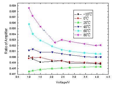 (2) 電壓檢測電路的誤差。電壓檢測電路中的誤差主要來自於電阻對的偏差以及三極管的偏差。對電壓檢測電路在不同溫度下的放大倍數進行了實驗,結果如圖4所示。