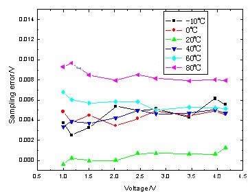 光電繼電器部分的檢測誤差不僅隨著溫度變化,同時也隨著被測量的電壓值變化,從圖3中可以看到,同一測量溫度下,1V與4V的被測量電壓之間的測量誤差達到12mV。從圖5中可以看到,而采樣係統的誤差僅僅同溫度有關,而與被測量電壓值無關。