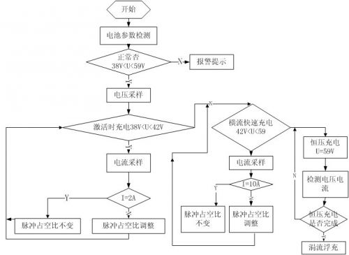 激活充電:充電器開始工作後單片機采集采集蓄電池端電壓檢測,若電壓過低說明曾過度放電,為避免充電電流過大,實行小電流激活。