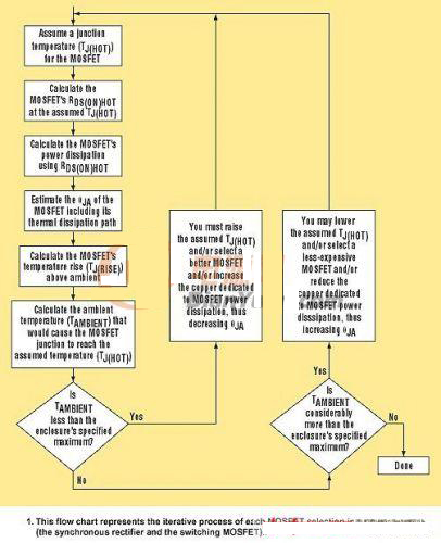 這一過程從首先假設各MOSFET的結溫開始,同樣的過程對於每個MOSFET單獨進行。MOSFET的功率耗散和允許的環境溫度都要計算。
