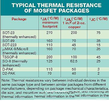 例如,采用1平方英寸的銅片,D-Pak的ΘJAD-Pak可能是50°C/W。但如果銅片就設在封裝引腳下,ΘJA值將會加倍(參見表)。采用多個並聯MOSFET,ΘJA主要依賴於它所安裝的銅片麵積。兩個元器件的等效ΘJA可能是隻有一個元器件時的一半,除非銅片的麵積加倍。就是說,增加並聯MOSFET而不同時增加銅片麵積,將使RDS(ON)減半,但對ΘJA的改變小得多。