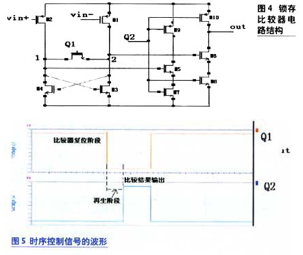 因前置放大器的增益與輸入電壓的乘積不足以達到輸出VOHdeyaoqiu,suoyibafangdahoudedianyazaijiadaosuocunqishangjikeyidedaosuoyaoqiudedianya。disanjibijiaoqidejiegoucaiyongkezaishengbijiaoqi,tayeshishiyongzhengfankuilaishixianlianggexinhaodebijiao。kezaishengbijiaoqiyouchengweisuocunbijiaoqi。bijiaoqizhongliangxiangfeijiaodieshizhongkongzhi,quedingbutongdegongzuomoshi,congershixianbijiaoqidefuweiyushuchu。qidianludetuopujiegourutu4所示。其中兩相非交疊時鍾Q1和Q2的波形如圖5所示。