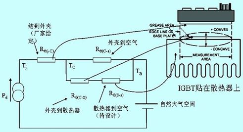 圖2中:rθ(j-c)是器件結到管殼基準點穩態熱阻,由製造廠家提供,一般在數據表中給出上限值或給出瞬態熱阻曲線取t→∞的穩態值;rθ(c-a)是管殼未通過散熱器直接到空氣的熱阻,通常不考慮;rθ(c-s)是管殼到散熱器的觸熱阻,通常由製造廠家在數據表中給出;rθ(c-a)是散熱器基準點到環境基準點的熱阻,其值由散熱器形式、尺寸和冷卻方式決定;ta是環境溫度。