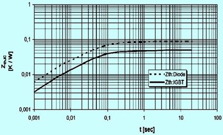 通常處於周期性脈衝功耗負載下的平均和最大結溫可以參考廠家所給出的瞬態熱阻曲線來計算。如圖3示出了eupc型號為bsm400ga120dlc的igbt模塊瞬態熱阻曲線zthjc=f(t)。