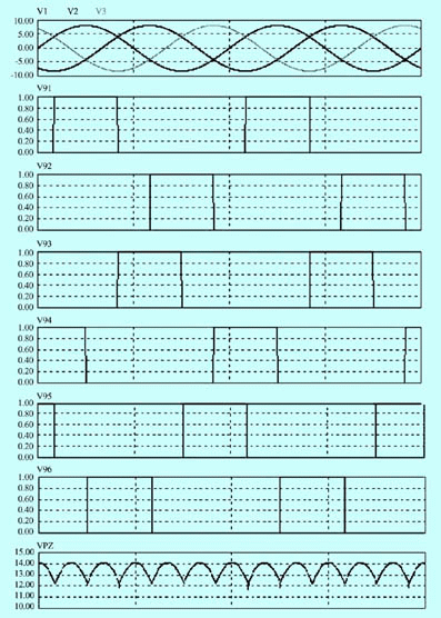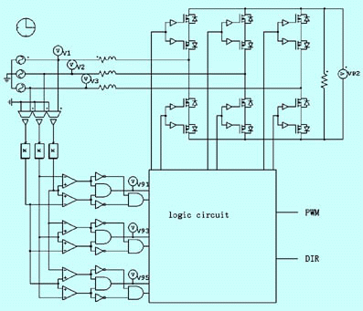 虛xu擬ni整zheng流liu技ji術shu的de實shi現xian,主zhu要yao通tong過guo三san相xiang同tong步bu檢jian測ce電dian路lu取qu得de同tong步bu控kong製zhi信xin號hao,然ran後hou控kong製zhi功gong率lv器qi件jian來lai模mo擬ni二er極ji管guan橋qiao式shi整zheng流liu電dian路lu對dui三san相xiang交jiao流liu電dian進jin行xing整zheng流liu,同tong時shi防fang止zhi輸shu入ru的de三san相xiang交jiao流liu電dian相xiang間jian短duan路lu。其qi原yuan理li如ru圖tu9所示,是一個輸出方向固定的虛擬整流電路。仿真波形如圖5所示,它們分別是矩陣變換單元的三相輸入電壓、6路同步信號和虛擬整流後得到的輸出電壓波形。