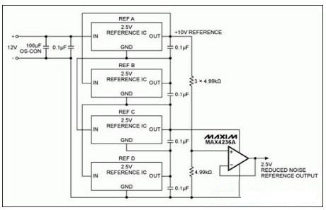 圖1. 由四路2.5V基準源串聯產生10V電壓,輸出分壓後得到2.5V,可使噪聲電壓減半。