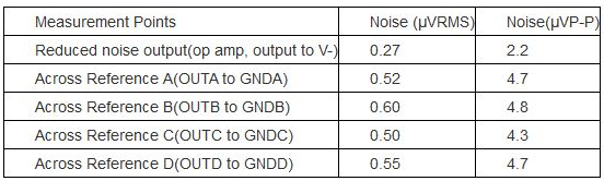 兩種類型2.5V電壓基準源可用於該設計。表1和表2所示為使用MAX6037或MAX6143基準源時所產生的電壓噪聲。每個表都顯示了4個基準源中每一個以及組合後產生的0.1Hz至10Hz噪聲電壓(RMS與峰-峰(P-P)值之比的偏差是由於測量P-P值時測量方法的主觀因素引起的)。