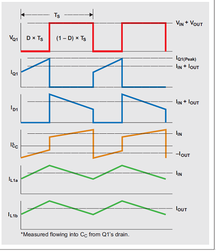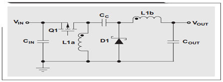 Q1 關閉時,L1b 的電壓必須為 VOUT,因為其與 COUT 並聯。由於 COUT 被充電至 VOUT,因此 Q1 關閉時 Q1 的電壓為 VIN + VOUT;這樣一來, L1a 的電壓便為相對於 Q1 漏極的 –VOUT。Q1 開啟時,充電至 VOUT 的電容 CC 與 L1b 串聯;因此 L1b 的電壓為 +VIN,而二極管 D1 的電壓則為 VIN + VOUT。