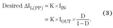 設計任何 PWM 開關調節器的首要步驟之一便是決定允許多少電感紋波電流 ΔIL(PP)。過多會增加 EMI,而過少又會導致不穩定的 PWM 運行。一般原則是給 K 分配一個介於 0.2 和 0.4 平均輸入電流之間的值。理想紋波電流的計算如下: