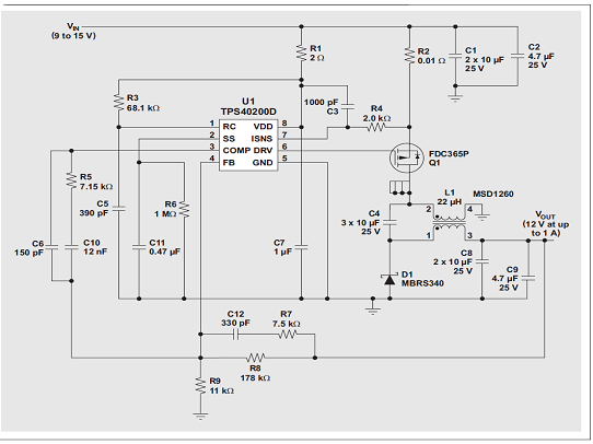 就本例而言,諸多要求都是針對一個 η= 0.9 峰值效率的 12-V、1-W 電源。負載為穩態,因此幾乎看不到負載瞬態。2-A 輸入電源為 9 到 15V。我們選擇了異步電壓模式控製器即 TI TPS40200,其工作在 340 和 460kHz 之間的開關頻率下。輸入端和快速電容器的最大允許紋波分別為彼此交叉最大電壓的 1%。最大輸出紋波為 25 mV,而最大環境溫度為 55ºC。由於 EMI 並不是問題,通過使用最小輸入電壓,我們選擇了具有更低電感值的電感。下一頁的表 1 概括了前麵介紹的一些設計計算方法。我們忽略了方程式 7 到 9 以及方程式 11,因為使用了高 RMS 電流額定值的低 ESR 陶瓷電容。