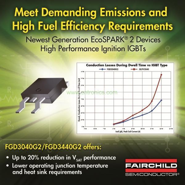 為了滿足現今和新興點火係統對排放和高燃油效率的嚴苛要求,汽車設計人員需要更高性能的點火線圈驅動器技術。為幫助設計人員滿足這些要求,飛兆半導體公司推出了在較小的占位麵積下具有更低功耗的最新一代點火IGBT器件。EcoSPARK2、FGD3040G2和FDG3440G2點火線圈驅動器可將VSAT降低多達20%,而不會顯著降低自箝位感性負載開關(Self Clamping Inductive Switching, SCIS) 的能量。這項優化特性減低了功耗和工作結溫,並降低了對散熱器的要求。