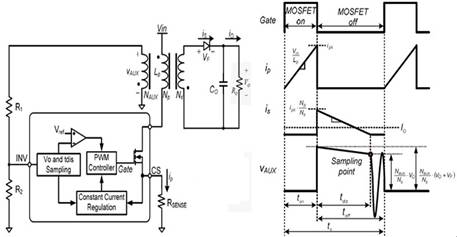 表(biao)示(shi),由(you)此(ci)可(ke)知(zhi),在(zai)去(qu)磁(ci)結(jie)束(shu)時(shi)間(jian)點(dian),次(ci)級(ji)繞(rao)組(zu)輸(shu)出(chu)電(dian)壓(ya)與(yu)輔(fu)助(zhu)繞(rao)組(zu)具(ju)有(you)線(xian)性(xing)關(guan)係(xi),隻(zhi)要(yao)采(cai)樣(yang)此(ci)點(dian)的(de)輔(fu)助(zhu)繞(rao)組(zu)的(de)電(dian)壓(ya),並(bing)形(xing)成(cheng)由(you)精(jing)確(que)參(can)考(kao)電(dian)壓(ya)箝(qian)位(wei)的(de)誤(wu)差(cha)放(fang)大(da)器(qi)的(de)環(huan)路(lu)反(fan)饋(kui),就(jiu)可(ke)以(yi)穩(wen)定(ding)輸(shu)出(chu)電(dian)壓(ya)VO。這時的輸出電流IO由公式