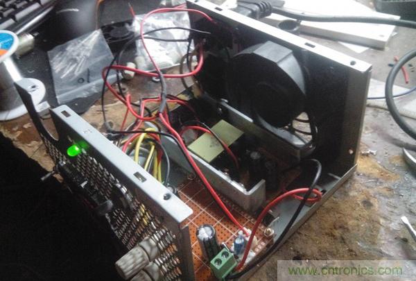 這會算是總裝前測試了,兩根白色線是模塊的軟啟動線,模塊控製腳通過100k電阻到Vcc,所以懸空都能使模塊工作,要讓它停止輸出,直接接地就好了,所以兩根線怎麼接,甭說了吧,都懂得。