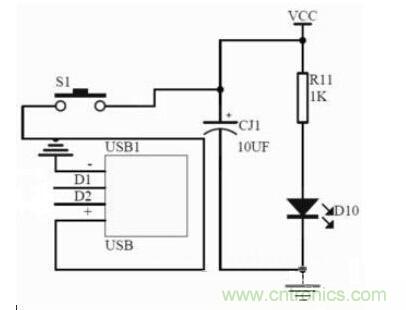 此最小係統中的電源供電模塊的電源可以通過計算機的USB口供給,也可使用外部穩定的5V電源供電模塊供給。電源電路中接入了電源指示LED,圖中R11為LED的限流電阻。S1為電源開關。