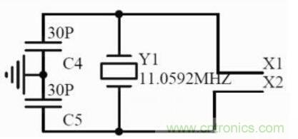 STC89C51使用11.0592MHz的晶體振蕩器作為振蕩源,由於單片機內部帶有振蕩電路,所以外部隻要連接一個晶振和兩個電容即可,電容容量一般在15pF至50pF之間。