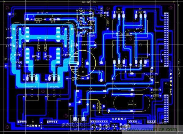 下麵是功率主板的PCB截圖,長寬為200X150MM,因為,這部分的電路比較簡單,就不給出原理圖了,直接畫了PCB圖,如圖1所示。