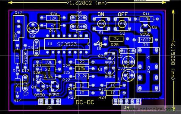 DC-DC升壓驅動板,采用的是很常見的線路,用一片SG3525實現PWM的輸出,後級用二組圖騰輸出,經實驗,如果用一對190N08,圖騰部分可以省略,直接用3525驅動就夠了。板上有二個小按鈕開關,S1、S2、S1是開機的,S2是關機的,可以控製逆變器的啟動和停機。