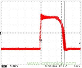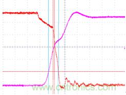 下麵這種情況有非常多的人會忽視,甚至是一些比較有經驗的電源測試工程師。下麵組圖四是下管打開,上管關閉時候的波形(圖4-1是示意圖,圖4-2示實際測試圖)。雖然沒有被同時帶起的情況,但是請注意上下管有交叉的現象,而且交叉點的電平遠高於MOS管規定的Vth值,這是個嚴重的shoot through現象。最直接的後果就是MOS管燒毀!