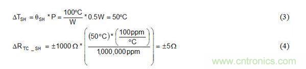 公式3可計算功率耗散所引起的電阻器溫度增加量ΔTSH。公式4將ΔTSH插入公式1替代ΔT,以確定100°C/W適度自發熱和0.5W功率耗散情況下自發熱所引起的電阻變化。
