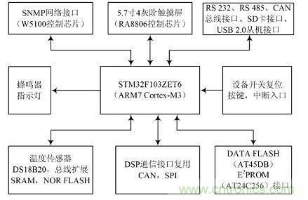 人機交互控製模塊是此IPS 設計中最為複雜的數字化管理模塊, 它不僅監測和管理逆變係統的運作, 還要保證IPS 控製器與外界的通信。設計中要求人機交互模塊能處理複雜的任務調度和很強的突發訪問( 中斷) 處理, 這就必須有較高運行速度;模塊內部還要有豐富的擴展接口提供IPS 與外部即時通信; 具備優越的總線控製和訪問機製等。綜合考慮上述需求, 設計中選擇了意法半導體( ST ) 公司推出的最新32 位單片機STM32F103ZET6 ( 以下簡稱ST M32) 。ST M32 是基於ARM7 Co rtexM3 內核架構的高速高性能嵌入式控製芯片, 擁有72 MHz 內核工作頻率和1. 25 DMIPS/ MHz的指令流水處理速度; 先進的總線結構和多達16 級的帶DMA 功能搶占中斷機製( NIVC) [ 10] 。如圖3 所示,設計中ST M32 通過SCI 接口及1 根中斷請求/ 接收線與DSP 2808 進行通信; 利用片上擴展的其中2 個SCI 口分別作為RS 232 和RS 485通信協議口; CAN 總線接口和U SB 總線通過共享數據緩衝區和中斷向量入口與外界互聯通信;通過STM32 的26 位地址總線和16 數據總線擴展外掛256 KB SRAM 和4 MB N OR FLASH, 以及8 位數據口的LCM 模塊RA8806 以及用於SNMP 的16 位並行數據的以太網芯片W5100; 啟用ST M32 的SDIO 總線以啟用用戶插入SD 卡存儲查詢IPS 狀態數據功能; 啟用現場環境下獨立時鍾看門狗電路和STM32 特有的窗口看門狗;啟用內部芯片溫度傳感器采樣監控, RC時鍾源以及外部喚醒功能; 通過通用引腳接入DS18B20 溫度傳感器對環境溫度的采樣, 預留I2 C 方式E2PROM 和SPI 方式的DA TA FLASH 接口為產品後續升級開發做準備。
