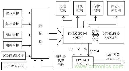 該模塊是逆變信號產生及反饋檢測調整模塊, 核心是一片C2000 係列高性能DSP 處理器TMS320F2808(以下簡稱F2808) , F2808 產生的SPWM 信號經過CPLD 進行邏輯延時移相形成三相逆變器IGBT 控製信號。F2808 是德州儀器( TI) 公司的一款高速DSP 芯片, 最高運行速度可達100 MIPS, 為適應工控強幹擾環境, F2808 內部集成了增強型輸入捕獲單元( eCAP) 和帶死區控製功能的輸出比較PWM 產生單元( ePWM) ,12 位16 通道快速ADC 單元; 內核支持用於定點DSP實現浮點運算的IQ 變換函數庫; 還有諸如SCI, SPI,eCAN 等豐富而通用的外設接口。如圖2 所示, 設計中F2808 的主要任務是監控IPS 功率部分的開關狀態和動作, 根據逆變器和負載狀態反饋調整3 路SPWM波形的輸出,電池充電脈衝控製。DSP 輸出的3 路SPWM 信號直接送給CPLD,經過CPLD 的等間隔脈衝延遲移相作為逆變器產生U, V, W 三相電的控製波形。