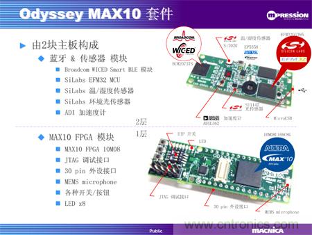 “Odyssey”開發套件是為物聯網應用而設計的開發與評估套件,用戶可在iOS和Andriod手機上安裝專用應用程序,直接通過藍牙接口讀寫分析數據以及遠程控製。該開發套件由一塊MAX 10 FPGA板卡和一塊藍牙及傳感器板卡組成。
