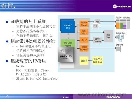 同期推出的還有駿龍科技基於MAX® 10 FPGA的電機驅動方案,通過FPGA實現馬達控製的算法核心,提供了高性能、定製化和單芯片的解決方案,為馬達控製帶來革命性的質的飛躍。使用FPGA 替代傳統的CPU/DSP架構實現算法,意味著所有的算法都將通過硬件實現,這樣由於處理能力限製而在CPU中無法實現的算法,現在都可以在MAX® 10 FPGA中以輕鬆地實現。Altera的MAX 10支持EtherCAT、Powerlink、Mechatrolink等工業以太網接口以及Endat 2.2, BISS等(deng)編(bian)碼(ma)器(qi)接(jie)口(kou),用(yong)戶(hu)可(ke)以(yi)該(gai)方(fang)案(an)中(zhong)實(shi)現(xian)靈(ling)活(huo)可(ke)定(ding)製(zhi)的(de)接(jie)口(kou)。該(gai)方(fang)案(an)還(hai)提(ti)供(gong)可(ke)定(ding)製(zhi)的(de)調(tiao)試(shi)界(jie)麵(mian),客(ke)戶(hu)可(ke)以(yi)根(gen)據(ju)自(zi)己(ji)的(de)需(xu)求(qiu),定(ding)製(zhi)自(zi)己(ji)的(de)調(tiao)試(shi)界(jie)麵(mian),實(shi)時(shi)觀(guan)測(ce)內(nei)部(bu)信(xin)號(hao)。