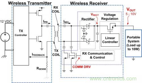 圖1中zhong顯xian示shi的de是shi一yi張zhang緊jin密mi耦ou合he智zhi能neng無wu線xian電dian源yuan係xi統tong的de簡jian化hua圖tu。如ru果guo從cong原yuan理li圖tu的de角jiao度du來lai看kan,它ta看kan起qi來lai很hen像xiang一yi款kuan變bian壓ya器qi耦ou合he隔ge離li式shi電dian源yuan轉zhuan換huan電dian路lu。然ran而er在zai這zhe裏li,初chu級ji線xian圈quan和he次ci級ji線xian圈quan是shi完wan全quan分fen離li開kai來lai,而er不bu是shi繞rao在zai同tong一yi磁ci芯xin上shang的de。電dian能neng從cong發fa射she器qi(初級,或TX)端傳輸到接收器(次級,或RX)端,而接收器電路以數字脈衝的形式將反饋發送回磁耦合器件。