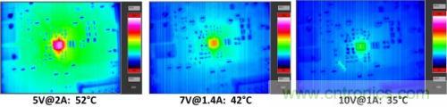 bq51025 10W無線接收器輸出電壓可在5V至10V的範圍內用外部反饋電阻器進行調節。這樣就可實現對一節或兩節串聯電池配置的充電,並且在與一個寬輸入電壓範圍開關模式NVDC類型充電器組合在一起時,能夠保持單節電池充電情況下的高效率。在諸如無線RX輸出情況下,NVDC充電器架構在減少較高電壓電源所需的輸入電流的同時,可實現低壓電池的高效充電。圖3顯示的是無線接收器電路板在為負載提供一個10W電源的同時,在5V,7V和10V輸出設置下的熱響應(分別為圖。 3a,b和c)。很明顯,10V輸出情況下產生的熱量最少,應該在高頻開關模式充電器可用於電池充電的情況下使用。