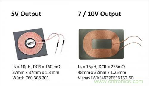 雖然理想狀態是最大限度地減少線圈的直流電阻(DCR),但是在較高的輸出電壓情況下,允許稍微地增加DCR來應對較低的電流。圖7顯示的是兩個典型RX端線圈。所有RX和TX線圈組裝時需要背麵屏蔽材料。