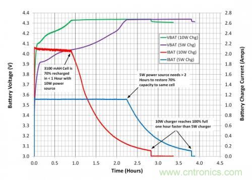 最後,執行一個10W無線電源係統的原因是減少高容量電池的充電時間。圖8顯示了與bq24261 NVDC開關模式充電器組合使用時,使用5W和10W無線電源係統時針對3.1Ah鋰離子電池的充電時間。充電時間被大幅減少—從使用5W充電器時接近4個小時減少到使用10W充電器時的少於3小時。由於鋰離子電池充電算法的逐漸降低“漸止”屬性,總充電時間的減少值與提供的電源不直接成比例。然而,代表滿充電狀態大約70%的恒定電流到恒定電壓模式的轉換點減小到了原來的一半(圖8)。