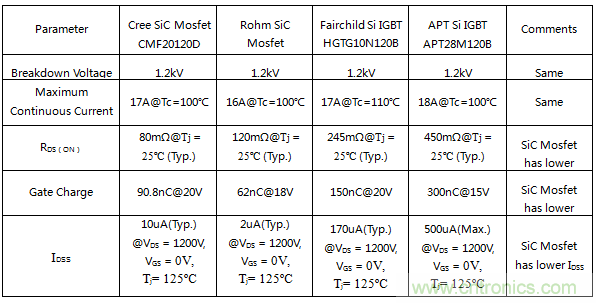 目前市麵上常見的SiC Mosfet電流均不大於50A,以常見的1200V/20A為例,列舉了Cree公司與Rohm公司的SiC Mosfet管的部分電氣參數;同樣例舉了Fairchild 與APT公司的1200V/20A Si IGBT係列的電氣參數進行比較;