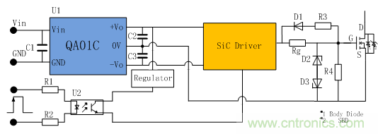 QA01C具有完整的驅動電路推薦,通過SiC驅動專用電源得到不對稱的正向驅動電壓20V,負向偏置關斷電壓-4V;為了防止驅動電壓對柵極造成損壞,增加D2和D3來吸收尖峰電壓是很有必要的。SiC驅動器采用一般驅動芯片即可;為了實現控製信號與主功率回路的隔離,需要采取隔離措施,推薦采用常見的光耦隔離方案。采用的光耦必須具有高共模抑製比(30KV/us)和比隔離電源大的隔離耐壓並且具有極小的延遲時間來適應SiC Mosfet管的高頻率工作特性。