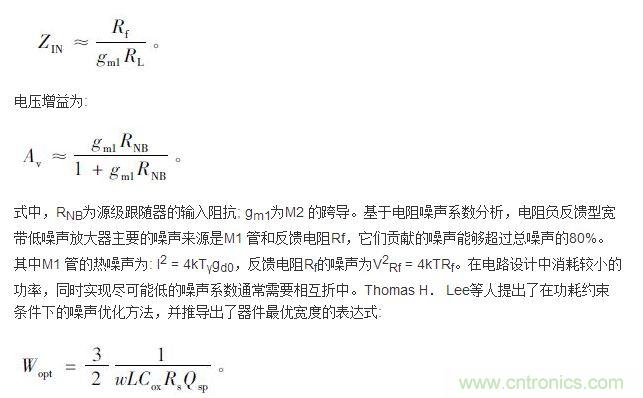 ③ M1 的溝道熱噪聲被反饋電路降低,在寬頻帶範圍內實現噪聲係數NF<3. 6 dB。通過分析小信號模型和噪聲係數,得到該結構的輸入阻抗為: