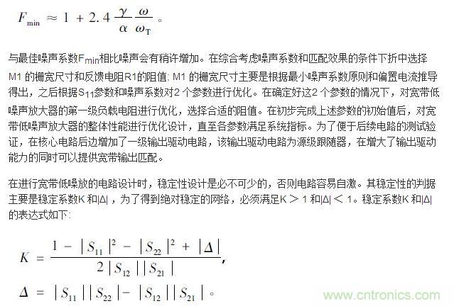 低(di)噪(zao)聲(sheng)放(fang)大(da)器(qi)是(shi)無(wu)線(xian)接(jie)收(shou)係(xi)統(tong)中(zhong)第(di)一(yi)個(ge)模(mo)塊(kuai),影(ying)響(xiang)著(zhe)整(zheng)個(ge)係(xi)統(tong)的(de)噪(zao)聲(sheng)性(xing)能(neng)和(he)靈(ling)敏(min)度(du)等(deng)參(can)數(shu)。隨(sui)著(zhe)超(chao)寬(kuan)帶(dai)技(ji)術(shu)的(de)發(fa)展(zhan),寬(kuan)帶(dai)低(di)噪(zao)聲(sheng)放(fang)大(da)器(qi)設(she)計(ji)已(yi)成(cheng)為(wei)當(dang)前(qian)設(she)計(ji)的(de)一(yi)個(ge)熱(re)點(dian)。根(gen)據(ju)目(mu)前(qian)國(guo)內(nei)外(wai)發(fa)表(biao)的(de)相(xiang)關(guan)文(wen)獻(xian),當(dang)前(qian)寬(kuan)帶(dai)低(di)噪(zao)聲(sheng)放(fang)大(da)器(qi)的(de)結(jie)構(gou)大(da)致(zhi)有(you)帶(dai)通(tong)濾(lv)波(bo)網(wang)絡(luo)匹(pi)配(pei)和(he)電(dian)阻(zu)負(fu)反(fan)饋(kui)2 種結構。