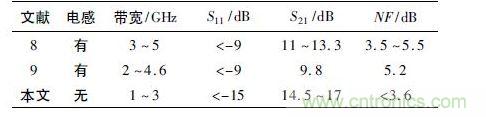 本文設計的寬帶低噪聲放大器與已經發表文獻中的寬帶低噪聲放大器的性能比較如表1 所示,這些文獻均采用0. 18 μm 工藝進行設計,具有一定的比較意義。通過表1 keyikanchu,benshejizhonggexiangcanshudoudadaolejiaohaodexingnengzhibiao,bimianlechuantongjichengdianlushejizhongxuyaocaiyongdiangandequedian,erdiangantongchangzaidianlushejizhongzhanyongfeichangdademianji,benwenshejidekuandaidizaoshengfangdaqishenglvelechuantongdizaoshengfangdaqishejizhongdediangan,zhejiangzaihendachengdushangjianshaoxinpiandemianji; 更為重要的是該芯片依靠自身的MOS guanhebilidianzushixianleneipipei,bimianledapiliangyingyongshiyouyuxinpianneibucanshushougongyicanshuyingxiangerzaochengdewaiweipipeidianludegenggai,jianhualexinpiandeyingyong,zaishijidegongchengyingyongzhongjuyouzhongyaodeyiyi。