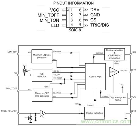 NCP4305可采用SOIC-8、DFN8和WDFN8三種封裝。MIN_TOFF 和MIN_TON引腳通過連接電阻到地,調節最小關斷和最小導通時間。LLD引腳用於在輕載時調節驅動器鉗位電平,或關斷驅動器。DRV引腳是同步整流MOSFET的驅動器輸出。CS(電流采樣檢測)引腳用於檢測電流是否流過同步整流MOSFET。TRIG/DIS引腳提供超快關斷輸入,用作在CCM應用中關斷同步整流MOSFET以提升能效,當上拉超過100 us時激活禁用模式。