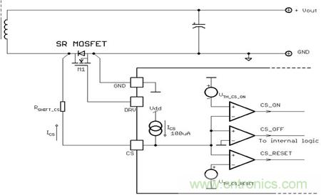 CS_OFF比較器是非常精密的真正的零比較器,通過同步整流將係統能效提升至最高。NCP4305的CS腳和SR MOSFET(M1) 之間的電阻用來調節關斷電流。當CS腳電壓低於VTH_CS _ON閾值時,M1 導通;當CS腳電壓高於VTH_CS _OFF閾值時,M1關斷。