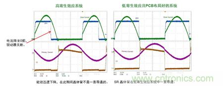 在CCM應用中,當初級端MOS管導通時,通過隔離驅動器強製使次級端MOS管關斷;當初級端MOS管關斷, TRIG腳功能使次級端MOS管導通。這種交替導通特性大大提高係統能效。如圖5所示,無觸發功能的初級端和次級端驅動信號交疊的時間為40 ns,遠大於帶觸發功能的12 ns,也就是說,觸發功能將縮短延遲時間,從而降低損耗。